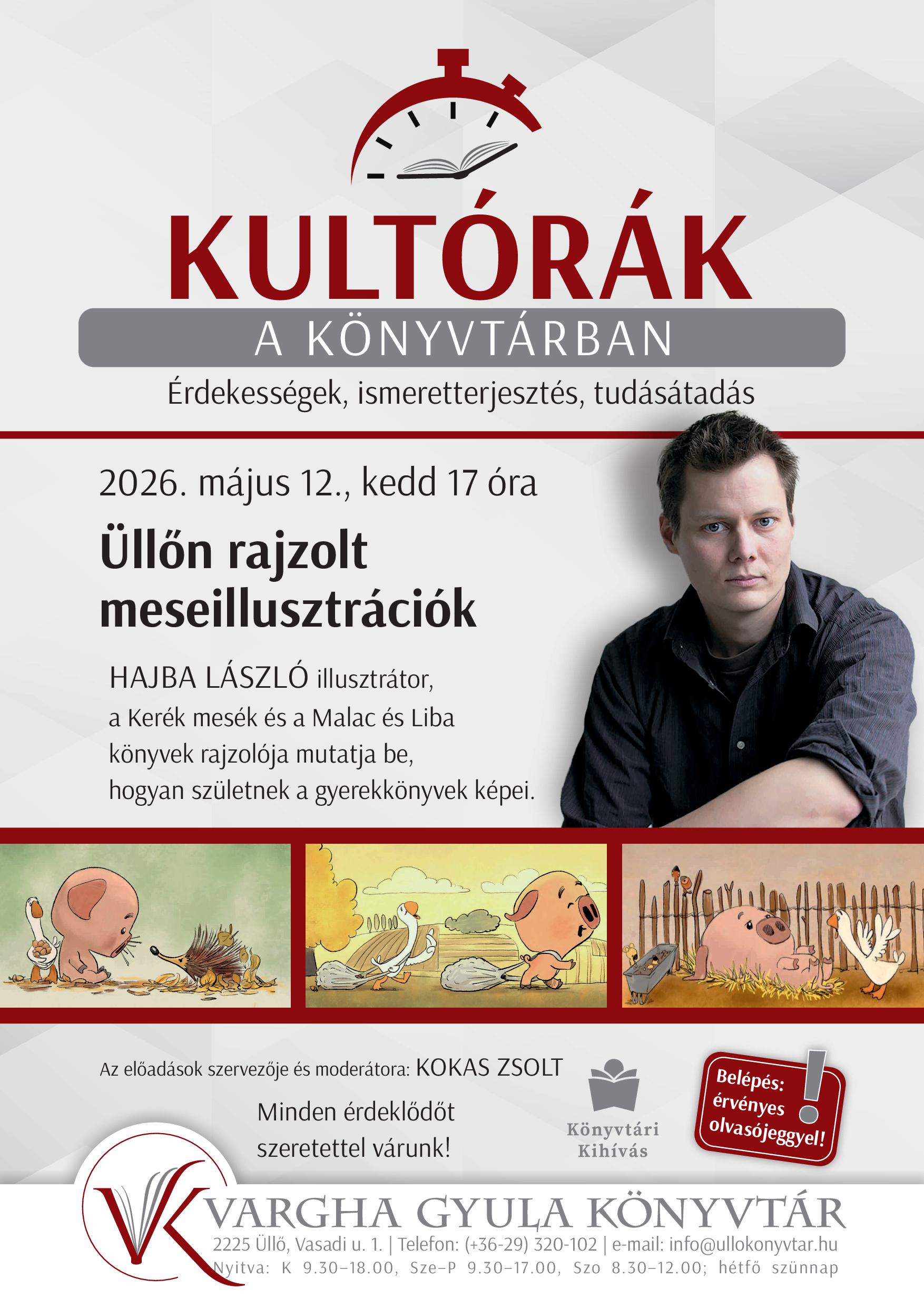 KULTóra – Hajba László – Üllőn rajzolt meseillusztrációk Tavaszi KULTóra Májusi KULTóra sorozatunk vendége Hajba László animátor a Kerék mesék és a Malac és a liba rajzolója Üllőn megrajzolt könyvekről fog előadást tartani. Minden érdeklődőt szeretettel várunk Május 12-én 17:00-kor!