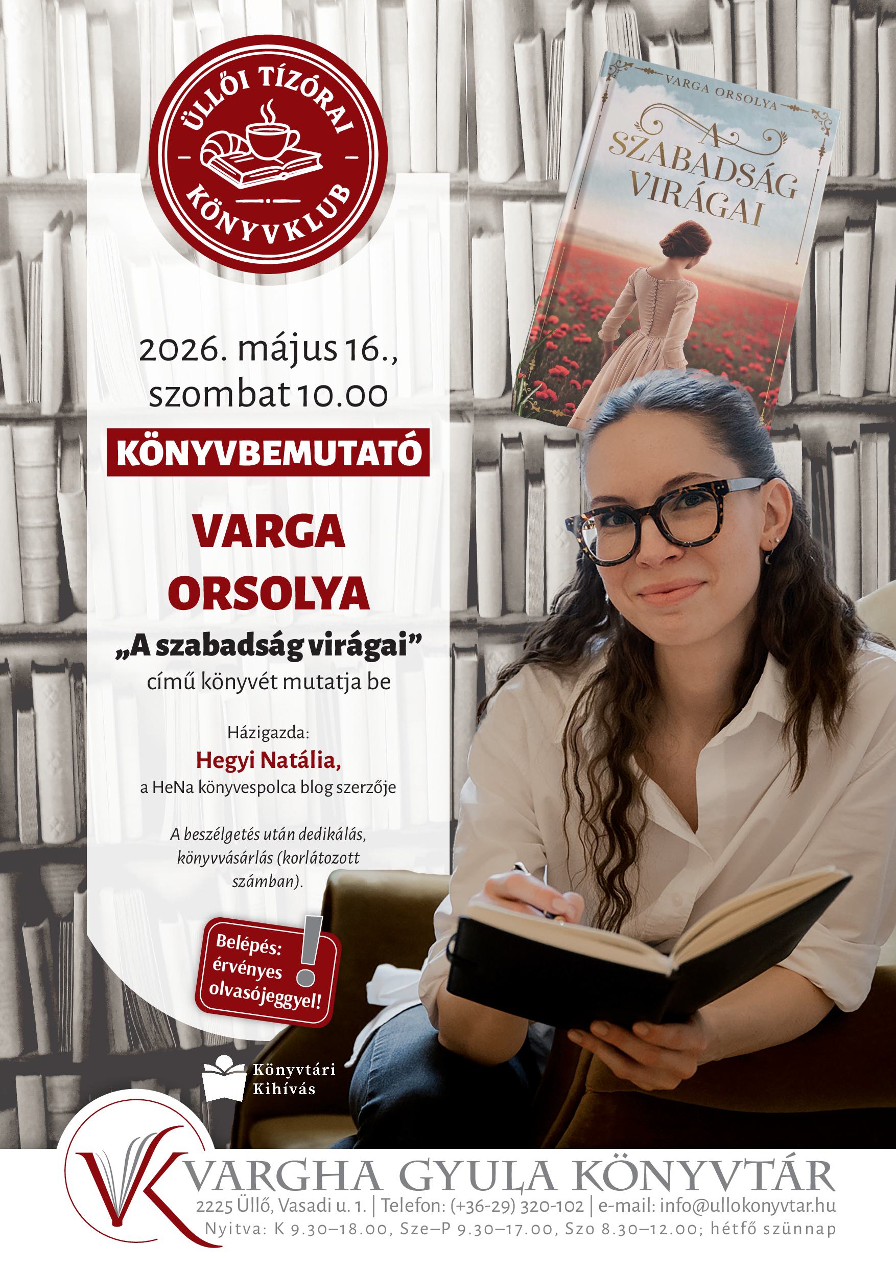 A könyvklub vendége Varga Orsolya, A szabadság virágai című könyv írója. A beszélgetést Hegyi Natália, a HeNa könyvespolca blog szerzője vezeti.