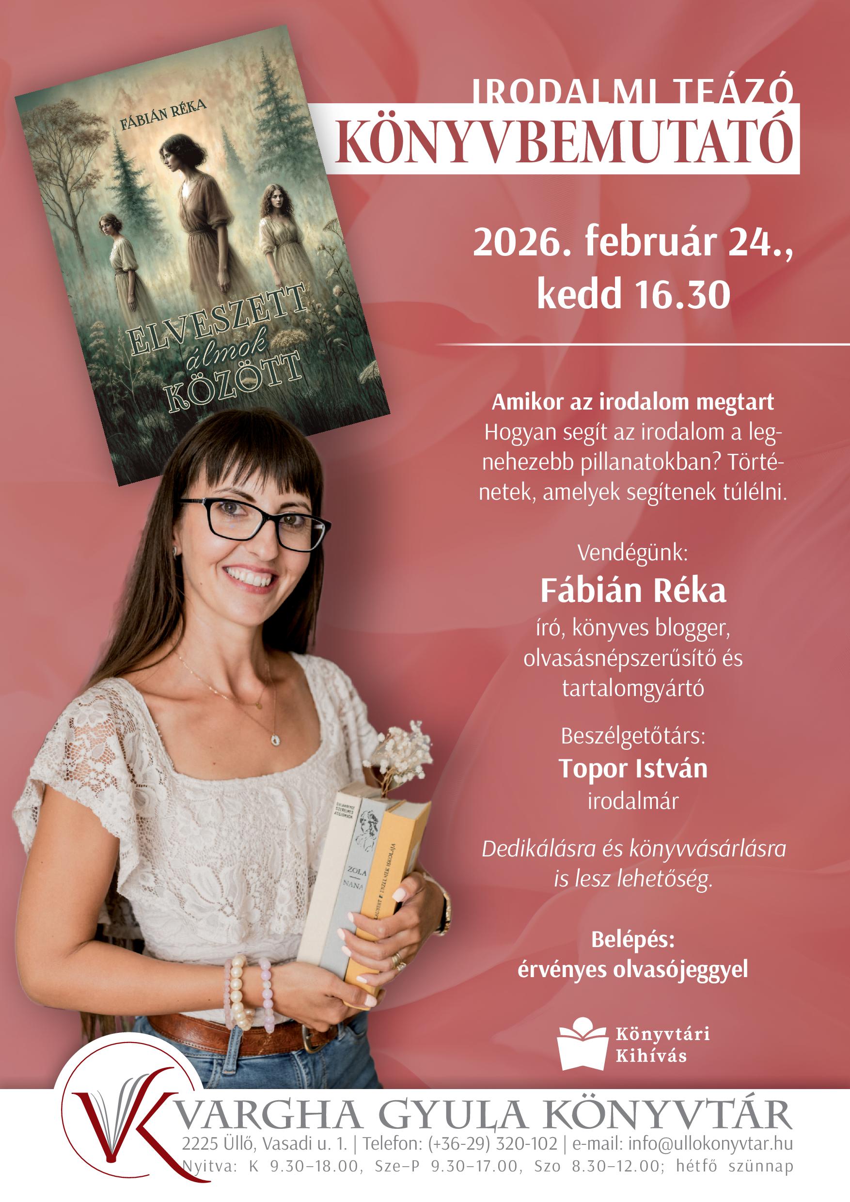 Szeretettel várunk benneteket egy meghitt beszélgetésre Fábián Rékával, az Elveszett álmok között című regény szerzőjével, ahol szó lesz irodalomról, túlélésről és történetekről.