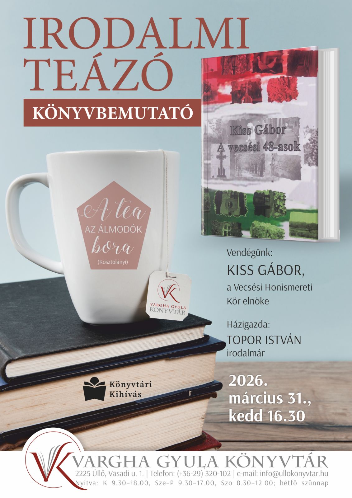 Következő teázónk vendége Kiss Gábor, a Vecsési Honismereti Kör elnöke, A vecsési 48-asok című könyvét fogja bemutatni. A beszélgetést Topor István irodalmár vezeti.