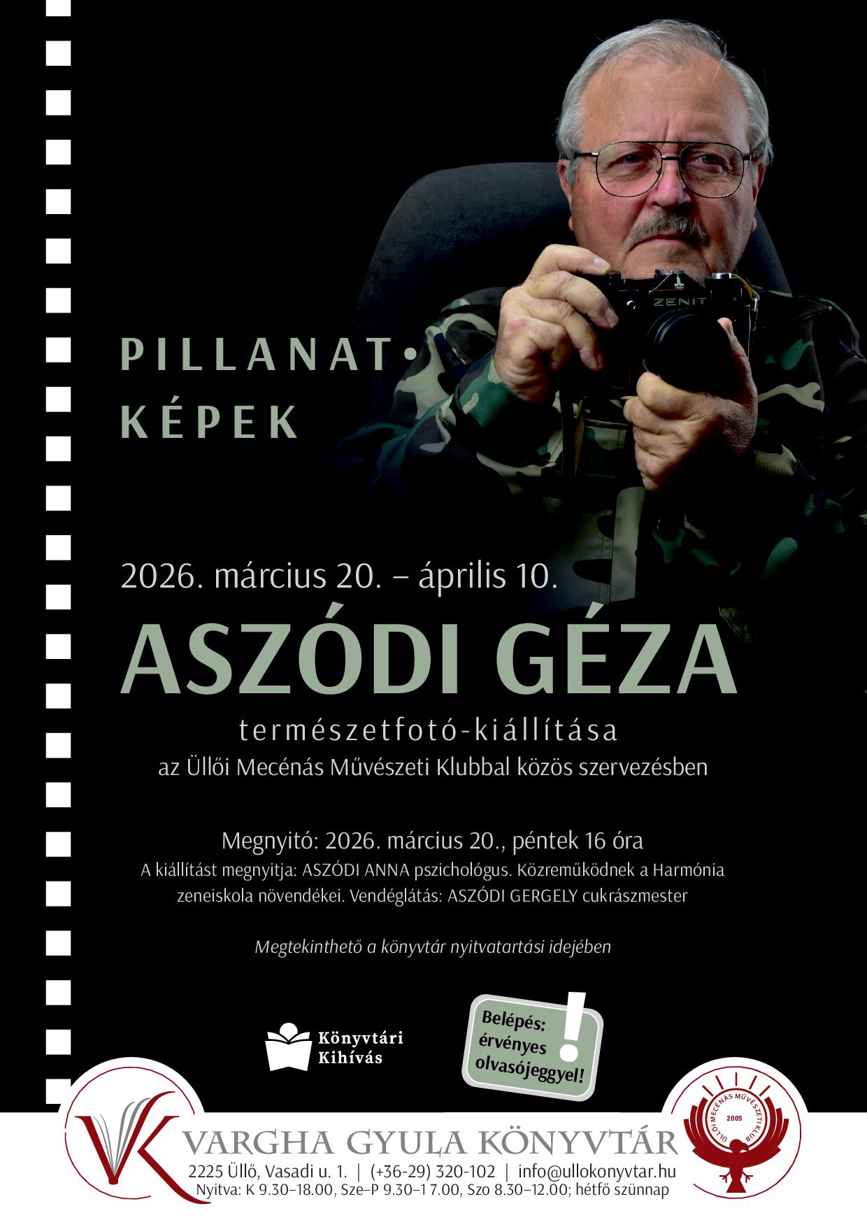 Szeretettel meghívunk minden érdeklődőt az Üllői Mecénás Művészeti Klubbal közös szervezésben Aszódi Géza lenyűgöző természetfotó-kiállítására, ahol a természet legszebb pillanatai kelnek életre a képeken keresztül.